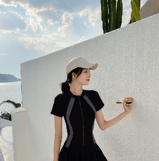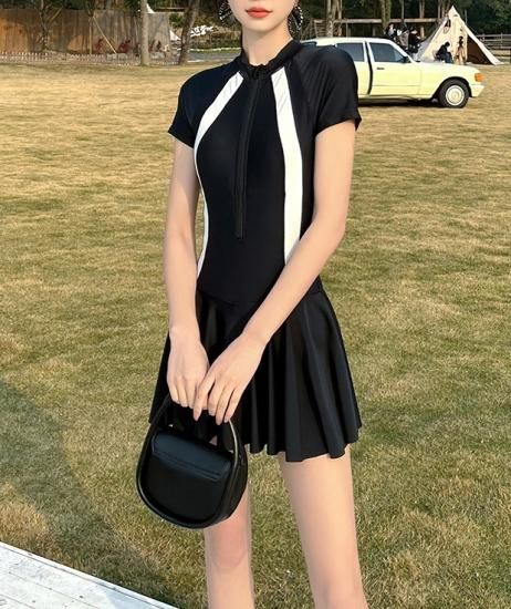 水着 ワンピース水着 フレアスカート ジッパー ハイネック2色