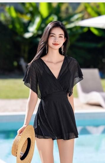 水着 ワンピース水着 Vネック フレアスリーブ 大人シンプル ブラック