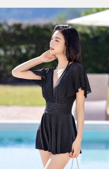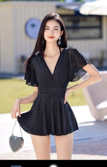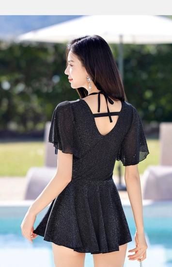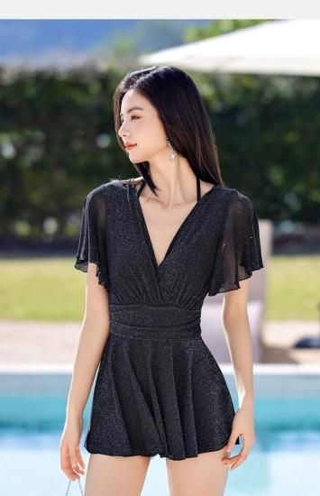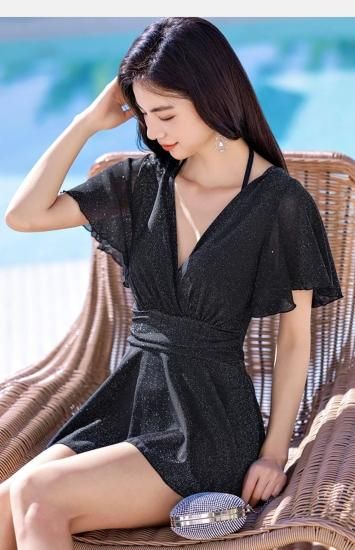 水着 ワンピース水着 Vネック キラキラ フレアスカート ブラック