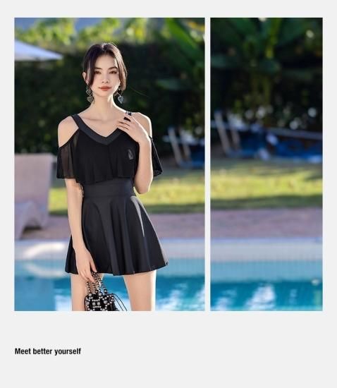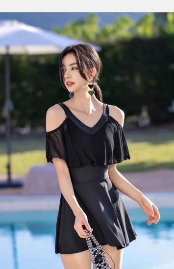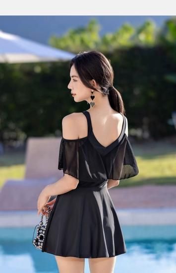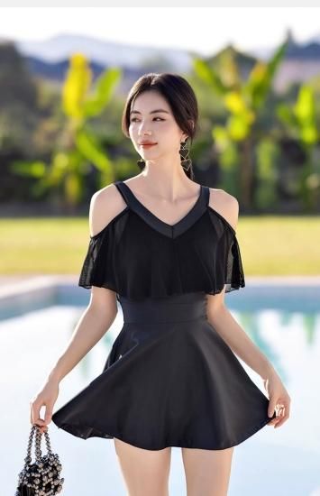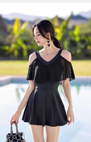 水着 ワンピース水着 オープンショルダー フレアスカート ブラック