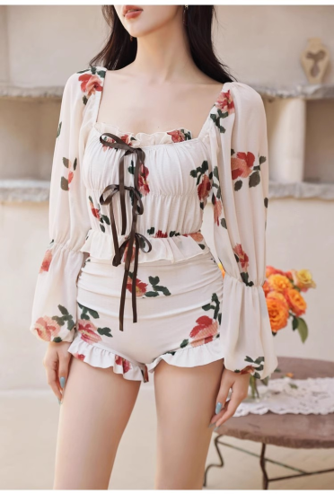 水着 ワンピース水着 花柄 パフスリーブ リボン アイボリー