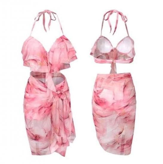 水着 ビキニ ストール付 シースルー ホルターネック 3点セット ピンク